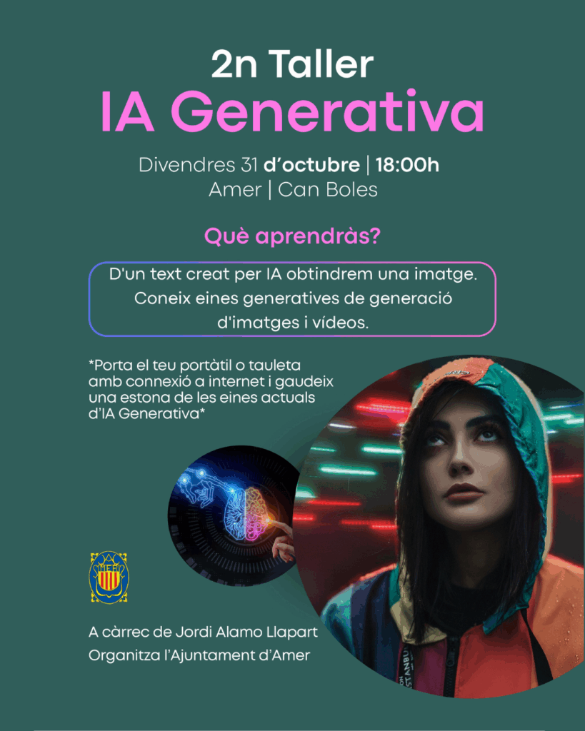 Divendres 31 d’octubre a les 18.00 h a Can Boles, 2n taller d’IA Generativa, una oportunitat per descobrir les possibilitats de la intel·ligència artificial aplicada a la creació de textos, imatges i presentacions.