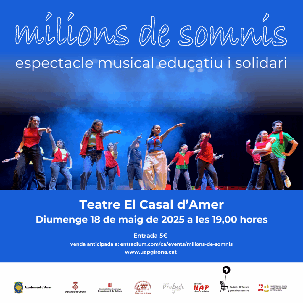 19.00 “Milions de somnis” és un espectacle creat per joves de 4t d’ESO que reflecteix els conflictes i diversitat d’opinions a l’hora de decidir el viatge de final de curs. A través de les seves històries personals, el grup aprèn a escoltar-se i buscar un somni comú. El projecte està impulsat per l’associació uap eduquem per la pau i es va estrenar el 21 de febrer al Teatre Municipal de Girona.