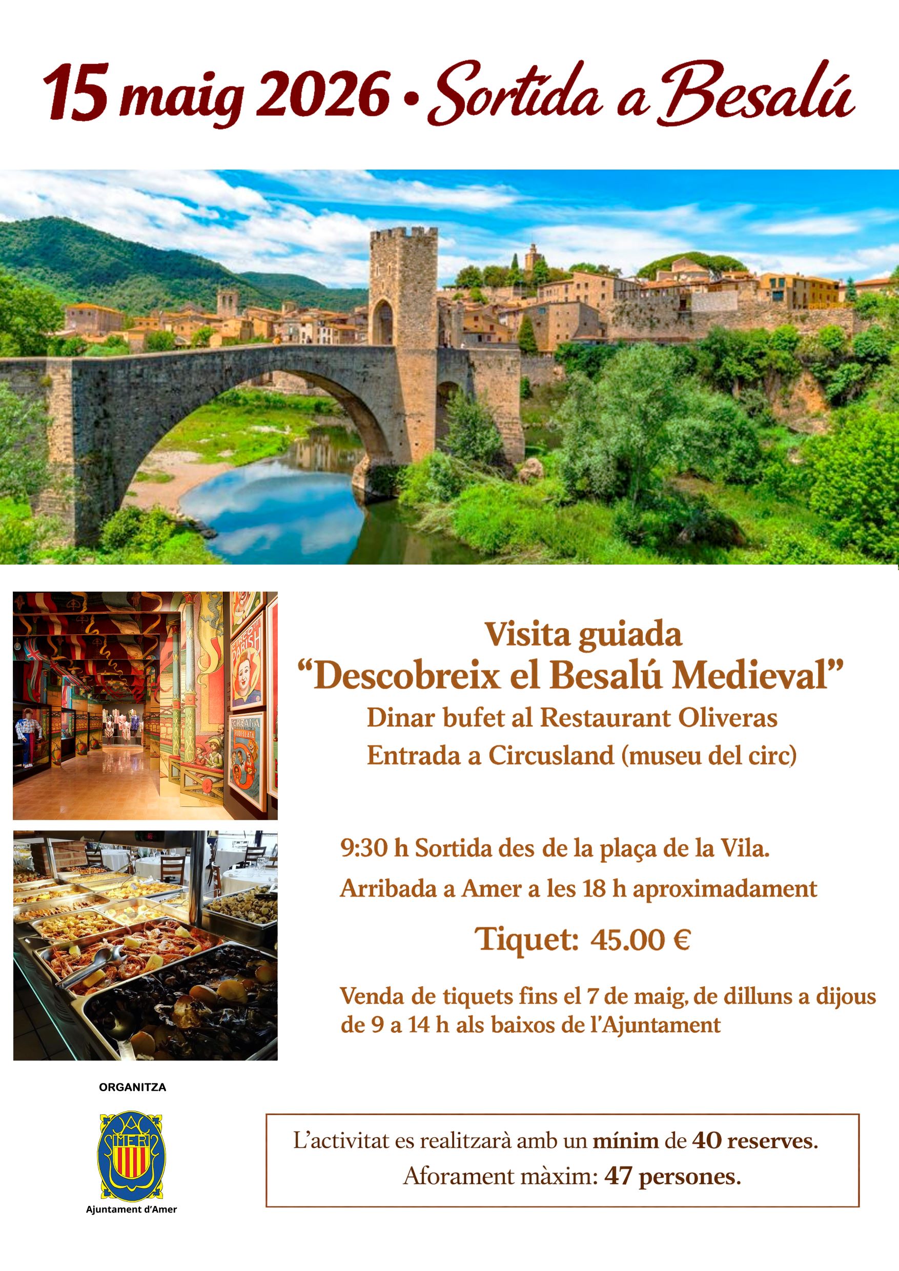 El proper 15 de maig descobreix la màgia de Besalú, una de les viles medievals més ben conservades de Catalunya, declarada Conjunt Històric-Artístic Nacional. Aquesta sortida inclou una visita guiada per conèixer la seva història, les seves llegendes i els racons més especials.La jornada es completa amb un dinar bufet al Restaurant Oliveras i una […]
