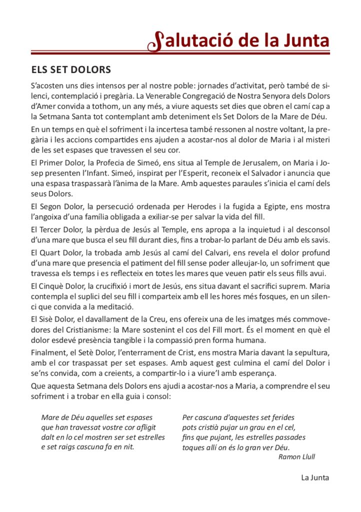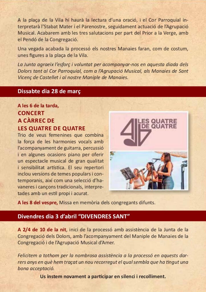 La Setmana dels Dolors d’Amer presenta un programa intens d’actes religiosos, culturals i tradicionals que combinen recolliment, patrimoni i participació popular.
