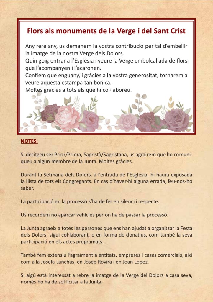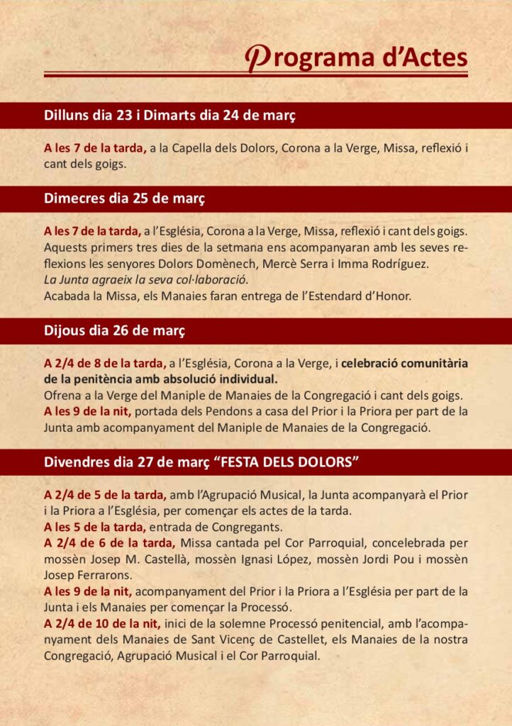 - 19:00 h · Capella dels Dolors. Corona a la Verge, missa, reflexió i cant dels goigs.