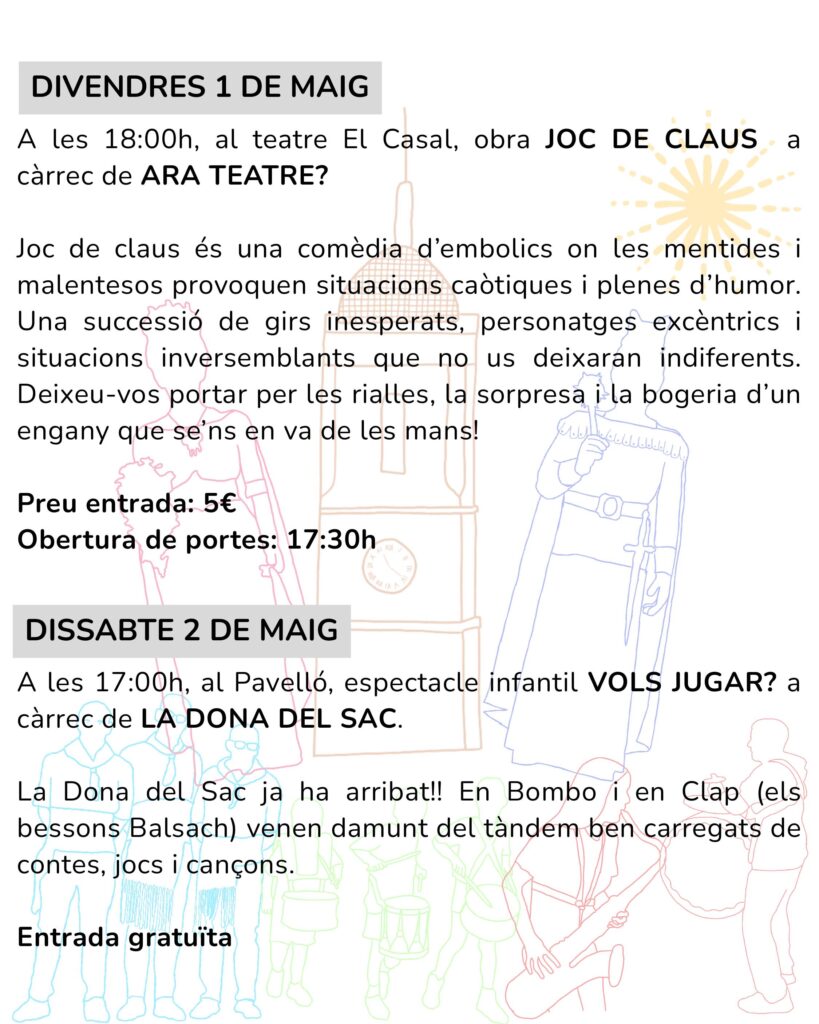 Dissabte 2 de maig, a les 17.00 h, al Pavelló, tindrà lloc l’espectacle infantil Vols jugar? a càrrec de La Dona del Sac. L’entrada és gratuïta.