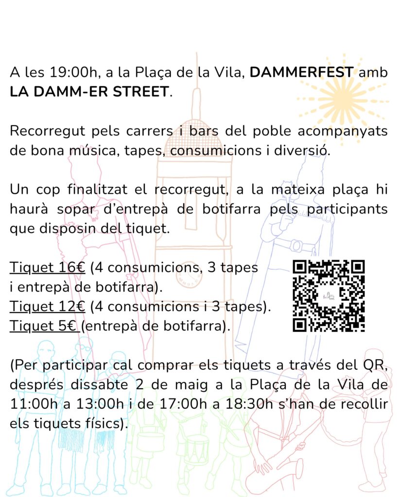 El mateix dia, a les 19.00 h, a la Plaça de la Vila, es farà el Dammerfest amb La Damm-er Street, amb un recorregut pels carrers i bars del poble. En finalitzar, hi haurà sopar d’entrepà de botifarra per als participants amb tiquet.
