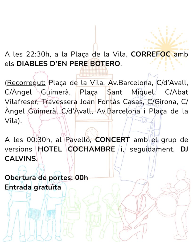 A les 22.30 h, a la Plaça de la Vila, es farà el correfoc amb els Diables d’en Pere Botero, amb recorregut pels carrers del municipi.