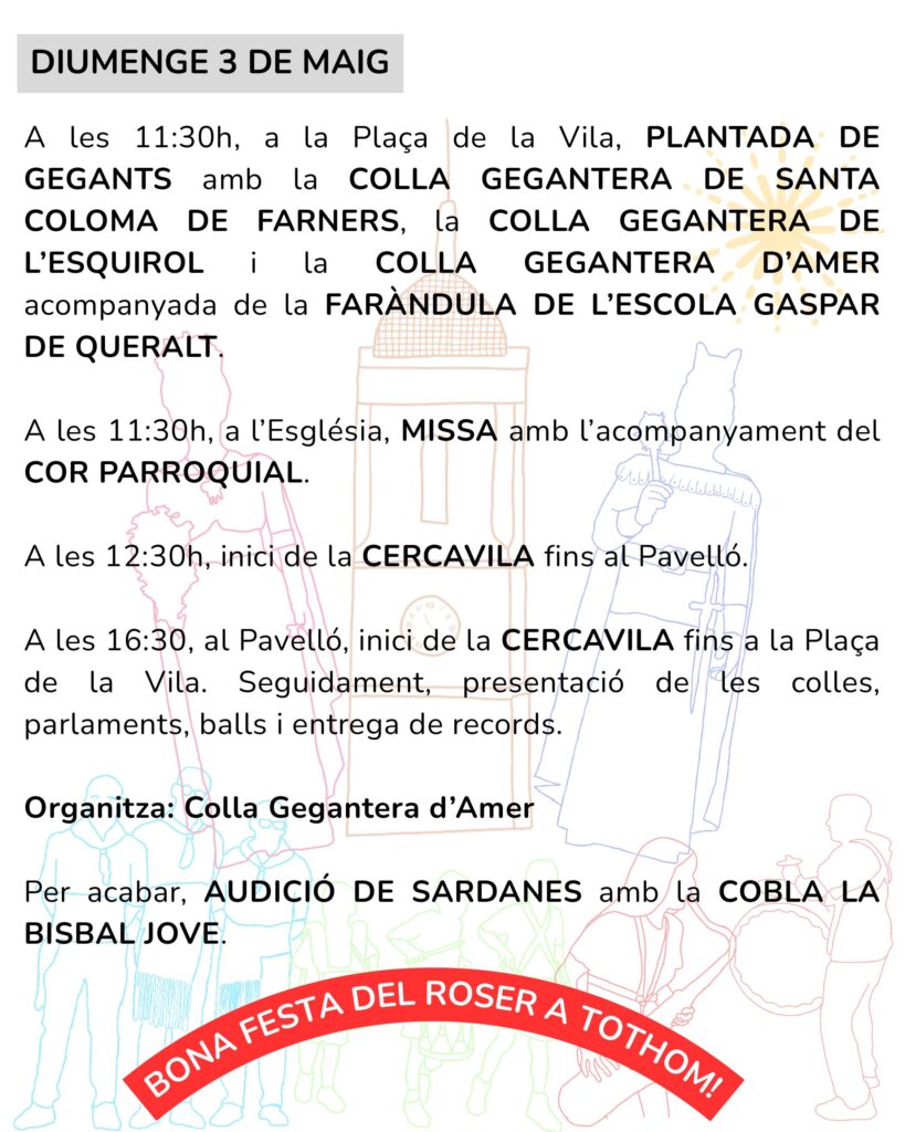 Diumenge 3 de maig, a les 11.30 h, a la Plaça de la Vila, es farà la plantada de gegants amb la Colla Gegantera de Santa Coloma de Farners, la Colla Gegantera de l’Esquirol i la Colla Gegantera d’Amer, acompanyada de la faràndula de l’Escola Gaspar de Queralt.