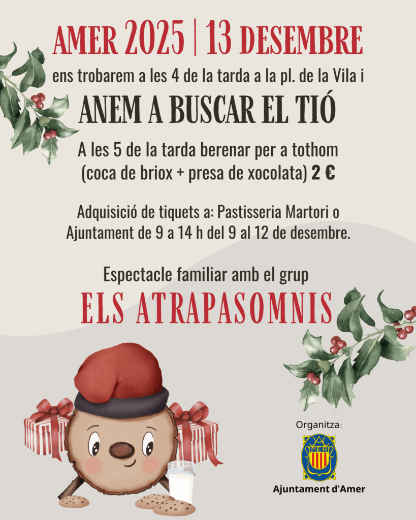 Venda de tiquets (2 €) a Pastisseria Martori o Ajuntament d’Amer de 9 a 14 h del 9 al 12 de desembre.